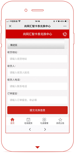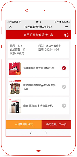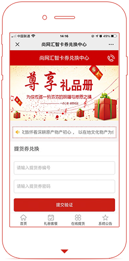 尚網(wǎng)匯智提貨系統(tǒng)適用于節(jié)日禮品兌換、大閘蟹提貨、海鮮提貨、水果提貨、茶葉提貨、大米提貨、農(nóng)產(chǎn)品提貨、月餅等提貨用途,以及禮券提貨、禮品卡、提貨卡等全平臺覆蓋的專業(yè)卡券解決方案。